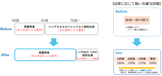 | 2002年 | シニアスキルスペシャリスト契約社員制度を導入 65歳以降も働くことができる制度(会社選択による) |