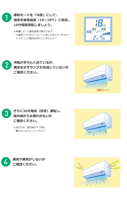 調査結果では、試運転をしない人の約3割が「やりかたがわらからない」という理由で試運転を見送っていることが判明しました。試運転の正しい方法をご理解いただき、冷房使用開始時にトラブル無くエアコンを使用していただくためにも、試運転の正しい手順とポイントをチェックしましょう。エアコン試運転については「エアコンスイッチオン!キャンペーン」サイトでも詳しく紹介しています。