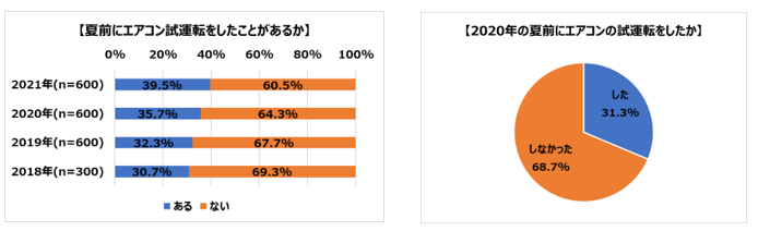 これまでに夏の冷房使用前にエアコン試運転経験のある方は39.5%と全体の約4割となりました。過去3年の結果から、試運転経験者の割合は着実に増えています。2020年夏の冷房使用前にエアコン試運転を行った方は31.3%でした。