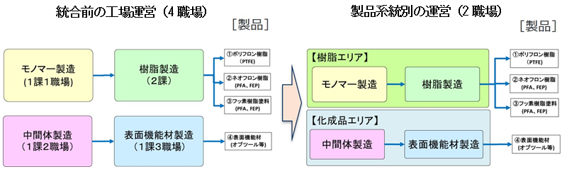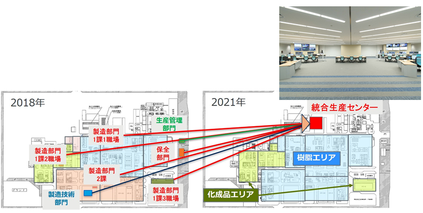 従来の4つの職場運営から「製品系統別(樹脂/化成品)の運営」に再編し、原料から製品が完成するまで生産情報を一気通貫に繋ぎ・把握して、オペレーターによる迅速な監視・判断・操作を実行します。