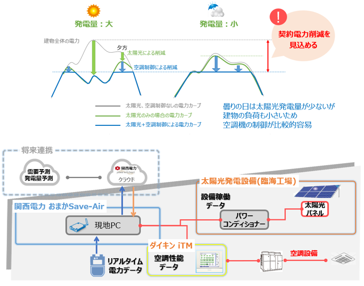 具体的には、当社堺製作所臨海工場に、関西電力の太陽光発電設備を設置し、当社の集中管理コントローラー「インテリジェントタッチマネージャー」※1(以下、iTM)と、関西電力の空調制御サービス「おまかSave-Air」※2を活用しながら工場内の電力需給を管理します。太陽光発電の出力変動に応じて、使用電力比率の高い空調機を最適制御する技術の確立を目指すものです。快適な職場環境や設備の安定稼働を維持しながら、契約電力※3削減を見据えた取り組みです。