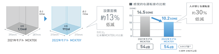 室内の空気質への関心が高まる中、空気清浄機にはこれまで以上に設置のしやすさや生活の邪魔にならない運転音などが求められています。本商品では、本体の構造・部品の配置を新規に見直すことで、設置面積を約13%低減。また、ワイドな吹出口の採用と送風ファンをフィルター下部に配置することによる防音効果で、人が感じる運転音(SONE値)を約30%低減しています。