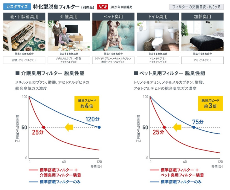 コロナ禍による換気意識の高まりは顕著ですが、当社の調査※7によると、換気の効果として求めるものに「部屋にこもったニオイを取り除きたい」と回答する方が多く見受けられました。新商品では、ペットや介護などによる特定のニオイ成分を強力に脱臭する5種類の特化型脱臭フィルター(別売品)をご用意しています。本フィルターは、添着させる薬剤の配合を変えることで、用途毎の臭気成分を強力に吸着し、脱臭性能を高めています※8。