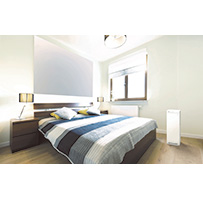 マットな質感を採用することで家具や壁紙、ファブリック等のインテリアに調和した上質な空間を演出。前面パネルと側面色をツートンで切り替え、軽やかな配色に仕上げています。また、本体側面に施したスリットにより圧迫感を軽減。操作表示部は天面配置で、湿度や風量などの必要な情報をLEDでシンプルに表示しています。また、操作表示部に抗菌処理を施すことで、操作時の安心感にも配慮しています。