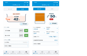 本商品はスマートフォンアプリ『Daikin Smart APP』との連携で、帰宅途中など外出先や、家の中の離れた場所から浴槽の湯はりや追いだきができるほか、給湯量を時間・日・月毎にグラフで確認できる機能※2が追加され、節水や節電行動をサポートしてくれます。また、給湯使用状況を遠隔から確認※2できるようになり、高齢のご家族の生活の見守りにも活用できます。ルームエアコンとの連動運転※2もでき、脱衣室の快適性向上や冬のヒートショック対策にも役立てられます。