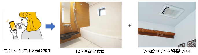 22年3月実装予定のエアコン連動機能では、『Daikin Smart APP』による操作で、お湯はりと同時に脱衣室のエアコンが自動でONになります。浴室内との温度差が軽減され、湯上り後も快適かつ安心してゆっくり過ごすことができます。またお部屋のエアコンとも連動でき、夏場は涼しく、冬場は暖かい、最適な温度環境づくりをサポートします。