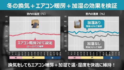 実際に、一般のお宅で、エアコン暖房をつけっぱなしにしながら定期的に窓開け換気をした際に、「加湿空気清浄機を使った場合」と「使わなかった場合」の湿度の違いを比較検証*2しました。