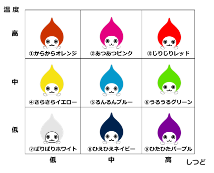 実際の温度と湿度の測定値に加え、季節ごとの風の強さ、代謝量、着衣量(代表値)に基づく『ダイキン空気感インフォメーション』で判定したその時々の空気感を、ぴちょんくんの色と擬音語で表現しています。色と擬音語は、色の効果や当社が過去に実施した『現代人の空気間調査』の結果も考慮しながら、それぞれの空気感のイメージにあったものを設定しました。