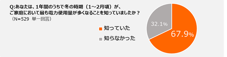 暑い時期でもエアコン等の使用により電気を使っている印象がありますが、冬のほうが電気代が高いことはどの程度知られているのでしょうか。「あなたは、1年間のうちで冬の時期(1~2月頃)が、最も電力使用量が多くなることを知っていましたか?」との質問に、約7割(67.9%)の方が「知っていた」と回答しました。多くの人が電気代をしっかりチェックし、冬のほうが高くなることを実感しているようです。