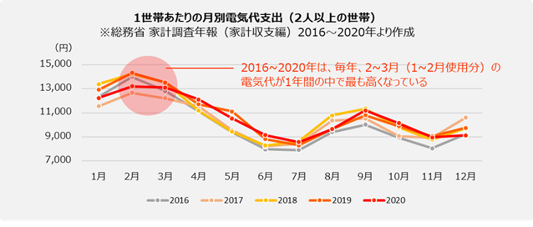 総務省が実施している統計によると、毎年2~3月の電気代支出が1年間の中でも大きくなっています。通常、電気代は当月に使用した分を翌月に支払っています。やはり一般家庭においては、気温が下がる1~2月の電気使用量が大きくなっていると推察されます。