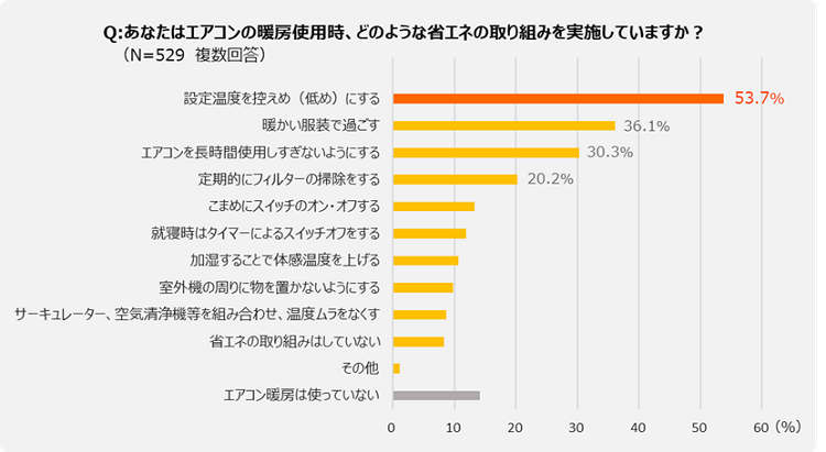 また、冬場によく使われるエアコンですが、「エアコンの暖房使用時、どのような省エネの取り組みを実施していますか︖」という回答に対して、「設定温度を控えめにする(53.6%)」「暖かい服装で過ごす(36.1%)」、「エアコンを長時間使用しない(30.2%)」との結果になりました。設定温度や使用時間を制限することで消費電力を抑えようとする人が多いようですが、時には省エネのために寒さを我慢しているのかもしれません。「定期的にフィルターを掃除する(20.2%)」や「加湿をする(10.6%)」などの省エネ対策も実践し、電気代を抑えながら、快適に寒い冬を過ごす方法を知っていただきたいと思います。