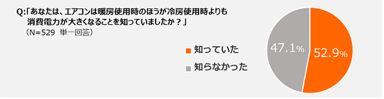 エアコン暖房は冷房よりも消費電力が大きくなる傾向にあります。「あなたは、エアコンは暖房使用時のほうが冷房使用時よりも消費電力が大きくなることを知っていましたか?」と聞いたところ、約半数の人は「知らない(47.1%)」と回答しました。多くの人がエアコンを暖房を利用しており、冬のほうが電気代が高くなることを知っているにもかかわらず、冷房よりも暖房運転時のほうが消費電力が大きいことは意識していない人も多いようです。