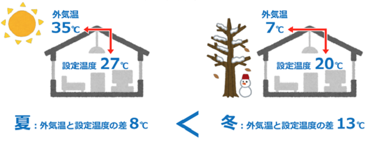 なぜ、暖房使用時のほうが消費電力は大きくなるのでしょうか。エアコンは屋外の空気中にある熱を室外機を通じて汲み上げ、お部屋の中を温めています。冷房使用時は逆に、室内の熱を汲み上げて屋外に排出することで、お部屋の中を冷やしています。外気温とエアコンの設定温度(室温)が大きいほど屋外と室内の間で運搬する「熱」の量が多くなり、その分、消費電力が大きくなります。冬は外気温が「0℃以下」になることもあり、冬のほうが外気温と設定温度の差が大きくなることが多く、エアコンの消費電力も大きくなるのです。