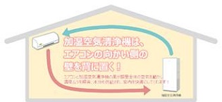 暖かい空気は上昇する性質があるため、室内の天井側と床側には温度ムラができやすくなります。一般的にエアコンの温度センサーは室内機にあり、天井側の空気が設定温度に到達すると、床側がまだ暖かくなっていなくても運転を弱めてしまいます。こうした場合にエアコンの設定温度を上げて床側を暖めようとすると、その分、消費電力が増加します。空気清浄機、サーキュレーター、扇風機などで天井と床の空気を撹拌し、温度ムラを抑えましょう。特に加湿空気清浄機を使用すれば、空気の撹拌と加湿を同時にできるので一石二鳥です。