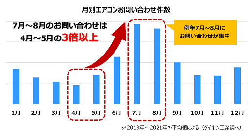例年、エアコンのお問い合わせや点検のご依頼は、エアコンを使い始める6月頃から増え始め、7月、8月 に集中します。混雑により暑い時期に修理対応をお待ちいただく場合があるため、本格的に暑くなる5月~6月前半に試運転を行い、早めに準備を済ませていただくことをご提案しています。