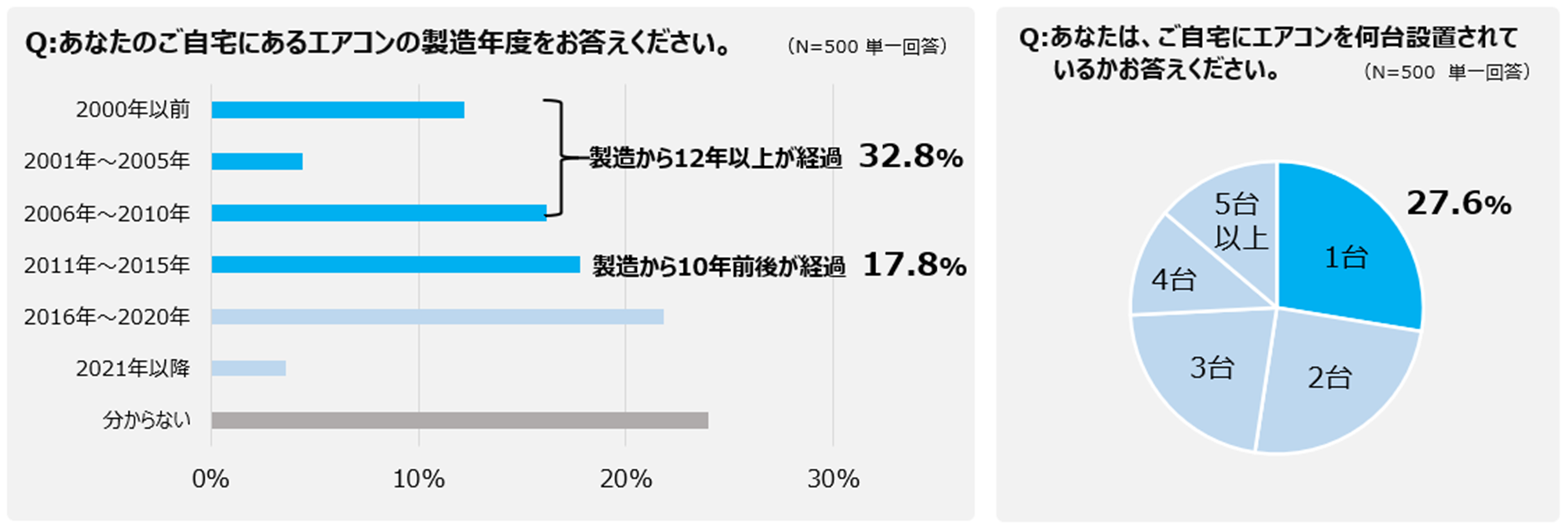 また、製造から10年前後(2011~2015年)が経ち、健康寿命をまもなく迎えるエアコンを所有する家庭は17.8%となりました。健康寿命とも言える「設計上の標準使用期間」を過ぎたり、まもなくその期間を迎えたりするエアコンを持つ家庭は過半数の50.6%にも達します。さらに、27.6%のご家庭ではエアコンの所有台数が1台ということも分かりました。