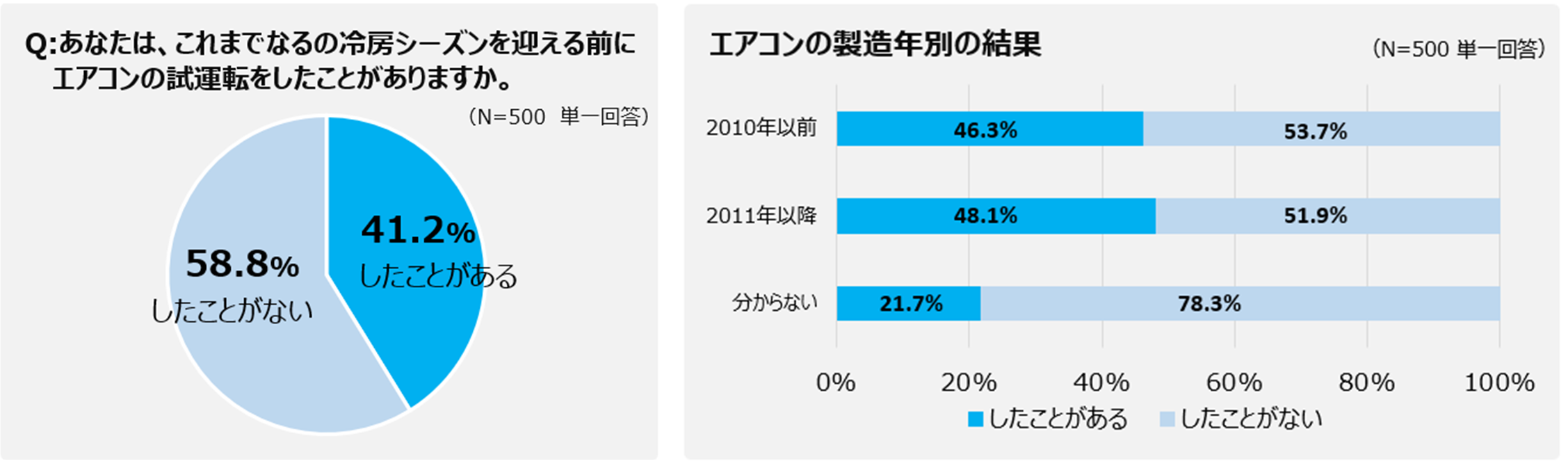 「あなたはこれまで夏の冷房シーズンを迎える前にエアコンの試運転をしたことがありますか」という質問に対して「したことがある」と回答したのは全体の半分以下の41.2%でした。健康寿命を大幅に超えたエアコン(2010年以前に製造)を使用中のご家庭に限っても、実施率は46.3%にとどまる結果でした。