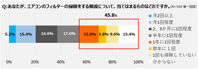 節電につながるエアコンのお手入れとして代表的な、フィルター掃除の頻度についても質問しました。特にエアコンを本格的に使用するシーズンには2週間に1回のフィルター掃除が理想ですが、調査結果では半数近くの45.8%が1年以上フィルターを掃除していないことが分かりました。フィルターを一年掃除しなかった場合、約25%の消費電力の無駄が発生するという調査結果もあり、また、フィルターの汚れは嫌なニオイの原因になることもあります。節電や快適性の維持にとって、重要な取り組みのひとつです。
