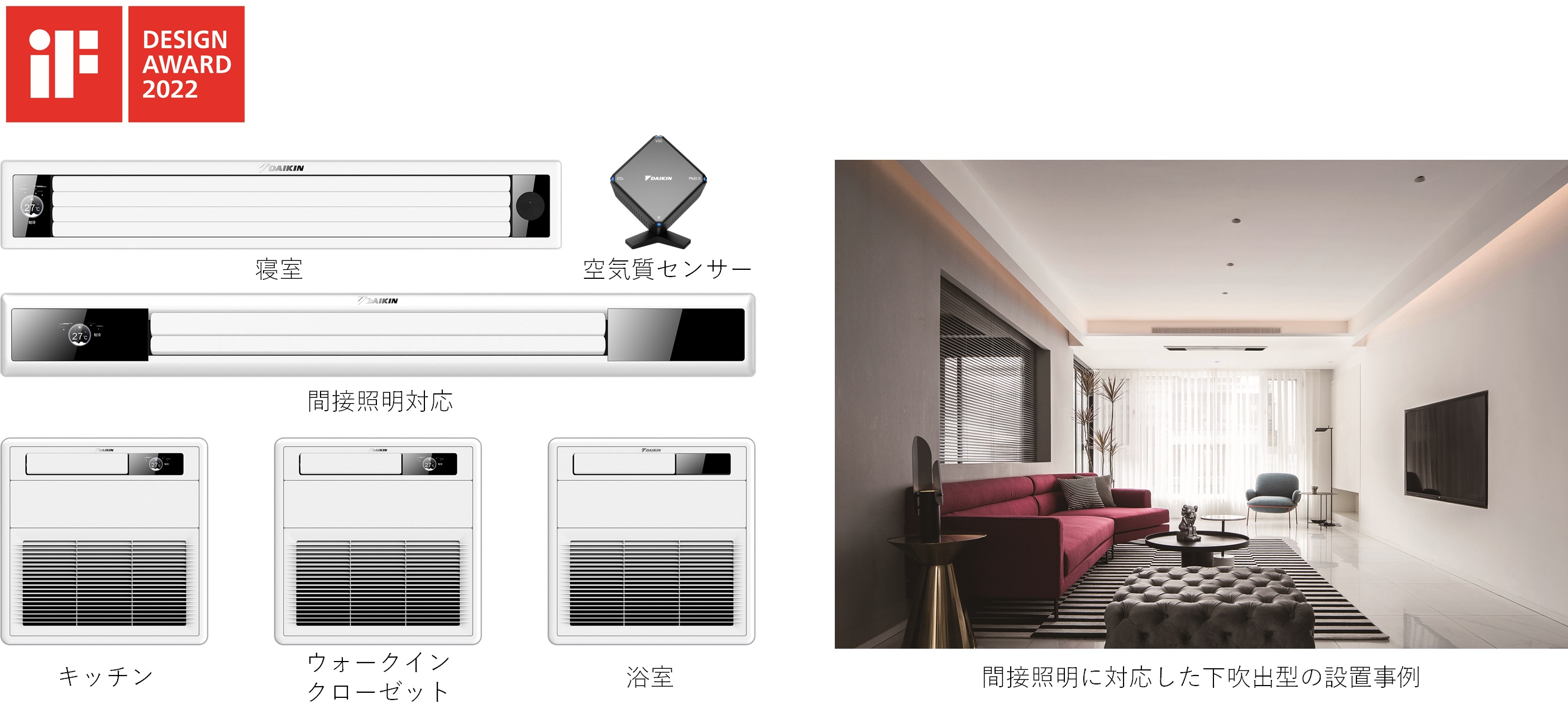 https://www.daikin.co.jp/design/2022/04/entry-83中国の高級住宅向けに、リビング、寝室、浴室、キッチンやウォークインクローゼットなどのあらゆる空間に適した機能を備え、温度、湿度、気流のバランスが取れた快適な空間を提供するマルチシステムエアコンです。中国で増加している間接照明を設置したリビング天井にも対応できるよう、スリムで下吹き出し型の室内パネルを設計し、より幅広いニーズに応えるラインアップを揃えました。また、それぞれの空間に最適なサイズと直線的な設計を取り入れたシンプルなデザインで、品位の高い仕上げにこだわりました。