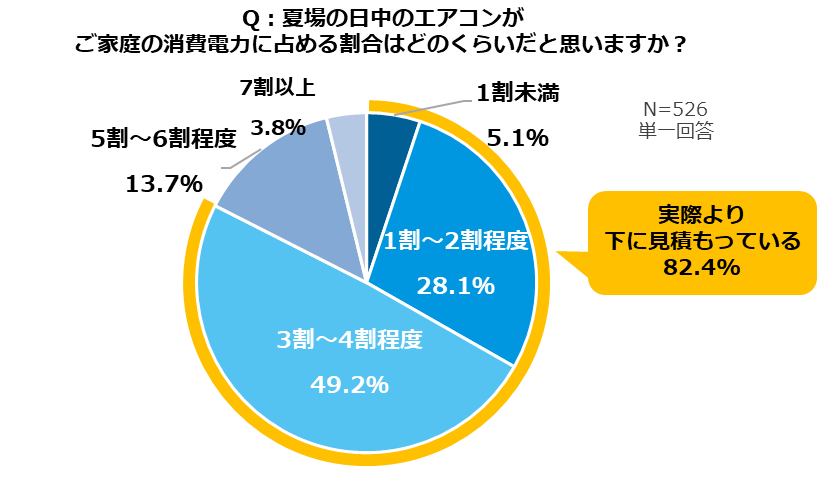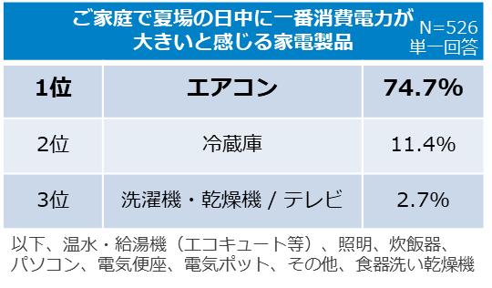 夏の電力需給に影響の大きいと考えられるエアコンの消費電力について、一般の方々には正しく理解されているのでしょうか。「夏場、一番消費電力が大きい家電」として約7割(74.7%)の人が「エアコン」と回答し、最も多い結果となりました。一方で、夏場の日中(ピーク時)におけるエアコンの消費電力の割合を「5~6割程度」と正しく回答できた人は約1割(約13.7%)と少なく、昨年同じ質問をした際 (13.4%)と大きく変わりませんでした。まだまだ多くの人がエアコンの消費電力を少なく見積もっているようです。エアコンの消費電力について正しい知識を身に着けることが、節電と環境貢献への第一歩かもしれません。