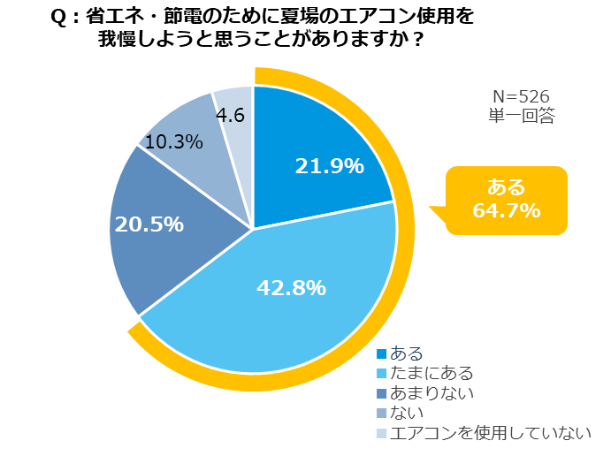 今回の調査で「電力需給のひっ迫や電気代の上昇を踏まえ、この夏、昨年よりも省エネ・節電に積極的に取り組みたいと思いますか?」と尋ねたところ、約9割もの人が「取り組みたい」と回答し、省エネ・節電への意識の高さが明らかになりました。一方で、「昨年以上の省エネ・節電のために具体的な取り組みのアイデアがない」という人は約7割にのぼり、多くの人が対策に頭を悩ませている実態も浮き彫りになりました。中には「省エネ・節電のためにエアコンの使用を我慢しようと思うことがある」という人も半数以上いました。
