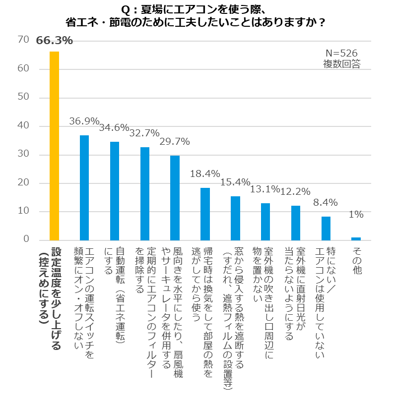 一方で「定期的にエアコンのフィルターを掃除する(32.7%)」、「室外機の吹き出し口周辺に物を置かない(13.1%)」など、その他の工夫ポイントについては1~3割程度の実施にとどまっており、まだまだ工夫の余地は大きいと言えそうです。これからこうした節電術が多くの人に取り入れられることで、無理のない省エネ・節電習慣になっていくことが期待されます。
