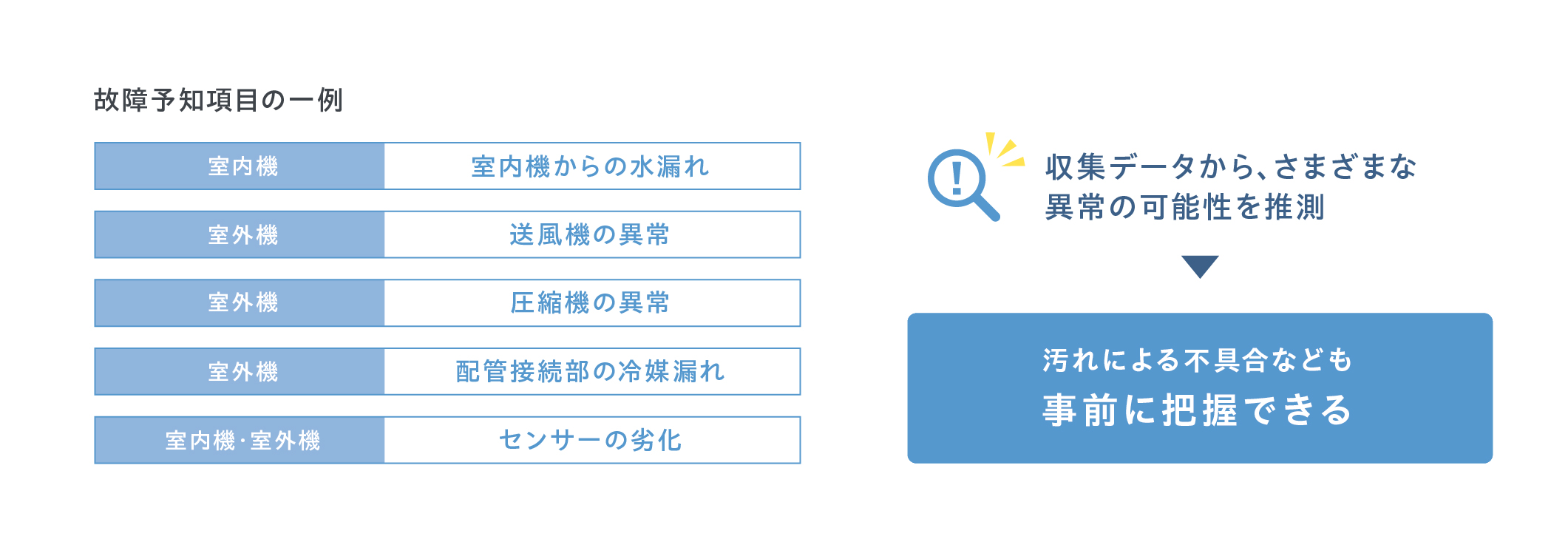 - これまで予知できなかった室内機からの水漏れや、電子部品の劣化などの予兆を検知できるようになり、空調機における故障予知可能な範囲を大幅に増やしました。