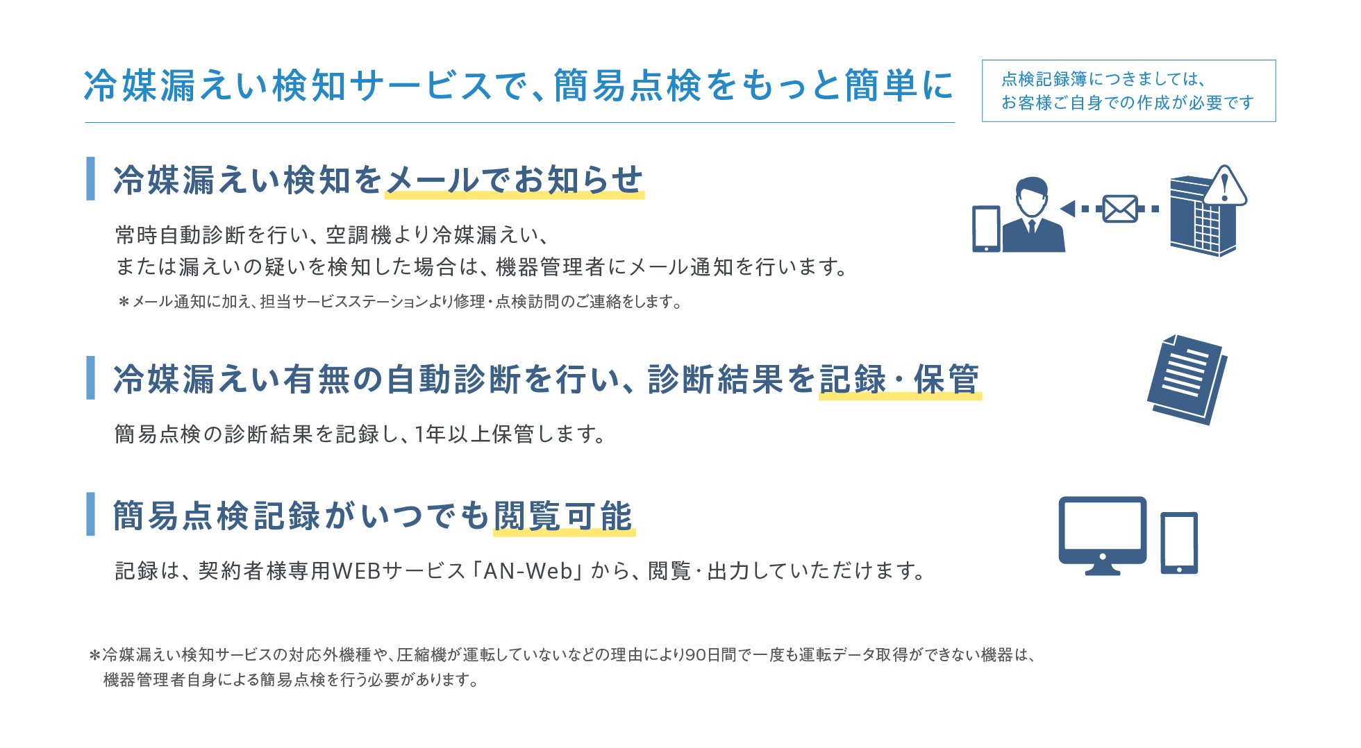 - 『エアネットサービス』は2022年8月に改正されたフロン排出抑制法に適用しており、目視による簡易点検を遠隔監視による自動点検に置き換えることが可能です。