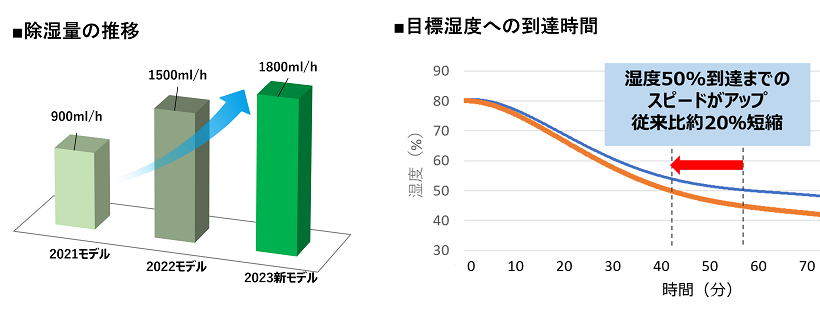 以前から搭載されている「さらら除湿(リニアハイブリッド方式)」の除湿量とスピードが約20%アップしました。風量と圧縮機の回転数の向上により、最大1,800ml/hの除湿が可能になりました※2※3。湿気が気になる日も体感温度を下げ、涼しい環境をよりすばやく実現します。
