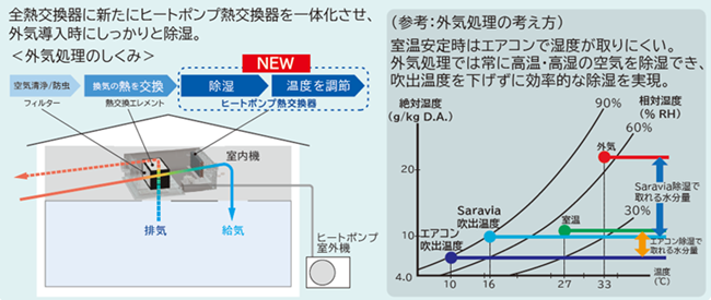建築物省エネ法改正による新築住宅の高気密・高断熱化やZEH化に伴い、全熱交換器を使用する換気は今後急速に普及すると予想されます。住宅性能を向上させると、冬場は暖房にかかる消費電力が削減でき快適性も向上します。一方で、夏場は室内で発生する湿気がこもりやすく、また湿気を含んだ外気が全熱交換器を通って入ってくるため、エアコンの除湿運転にかかる消費電力が増加しやすい傾向にあります。そこで当社は全熱交換器の機能向上に着目し、外気を取り入れる際に機内に搭載したヒートポンプ熱交換器で除湿(外気処理)をすることで、換気しながら各部屋のエアコンの運転負荷を軽減させる『Saravia』を開発しました。