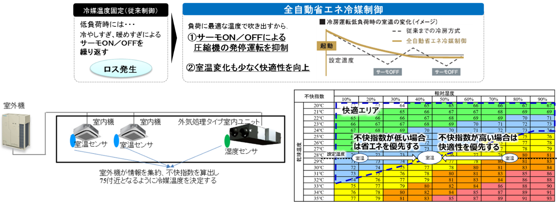 当社独自の全自動省エネ冷媒制御「VRTsmart制御」を換気※5による空調負荷の増大にも対応できるようにし、室内機からの吹き出し温度を運転負荷にあわせて最適に制御します。これにより冷やしすぎ・暖めすぎで圧縮機が発停を繰り返すことが抑制され、安定した室温の維持と消費電力の低減が可能になります。また室内の快適性を向上するには、湿度の制御が重要になります。本商品は空調機器の室温センサと換気機器の湿度センサ※6から温度と湿度の相関による不快指数を算出し、それをもとに省エネ性と快適性を両立する最適な運転制御を行います。これらの新機能の搭載で、年間消費電力量を約7%※2削減できました。