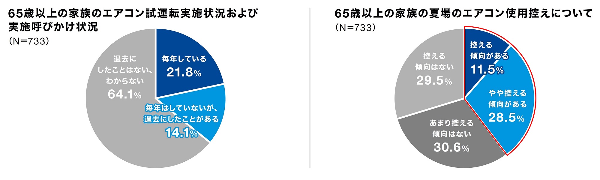 また、高齢家族の夏場のエアコン使用状況を伺うと、40%が夏場のエアコンの使用を控える傾向があることも分かりました。高齢者は、加齢により暑さを感じにくくなると言われており、気付かないうちに重篤な熱中症になってしまう可能性もあります。エアコンを適切に使うことを高齢者に呼び掛けることの必要性も浮き彫りとなる結果となりました。