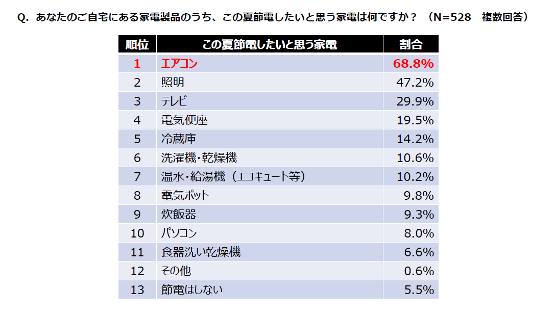 「あなたのご自宅にある家電製品のうち、この夏節電したいと思う家電は何ですか」という節電したい家電について尋ねる問いに、最も多く挙がったのがエアコン(68.8%)で、次いで照明(47.2%)、テレビ(29.9%)という結果になりました。