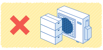 室外機の吸込口や吹出口がふさがれると、エアコンに負荷がかかってしまいます。エアコンの運転効率が下がることで、消費電力が上がり、電気代も上がります。室外機にカバーをかけたり、周辺に荷物を置いたりせず、室外機周辺の風の流れを妨げないようにしましょう。