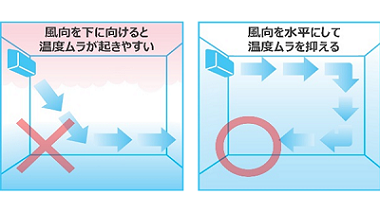 暖かい空気は上昇する性質があり、夏場の室内では、天井付近と床付近の空気の温度に差が出る「温度ムラ」が起こりやすくなっています。冷房運転時に温度ムラができていると、エアコンが「室内はまだ設定温度に達していない」と判断し、人がいる床付近は十分涼しくなっていても、必要以上に運転してしまうことがあります。快適性の低下だけでなく、エアコンへの負荷が上がり、消費電力の増加につながります。エアコンの風向を水平にしたり、扇風機やサーキュレーターなどを使って室内の空気を撹拌したりするなど、温度ムラを抑える工夫をお勧めします。