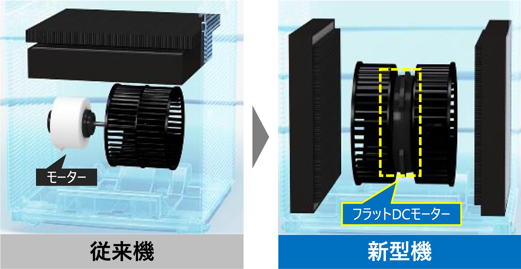 本商品は、ダイキンが空調機で磨き上げてきた磁石の成型技術を応用して開発した「フラットDCモーター」を業界で初めて空気清浄機に搭載し、大風量かつ省スペース化を実現しています。従来のモーターと比べて出力は1.2倍、厚さは約25%減、モーター回転時の振動を抑えています。モーターの薄型化の結果、部品の配置を刷新することで、ファンの直径を従来機と比較し、約30%大型化できたと同時に、吸込面積も約30%広がりました。また設置面積はA3用紙よりも小さいサイズを実現しています。