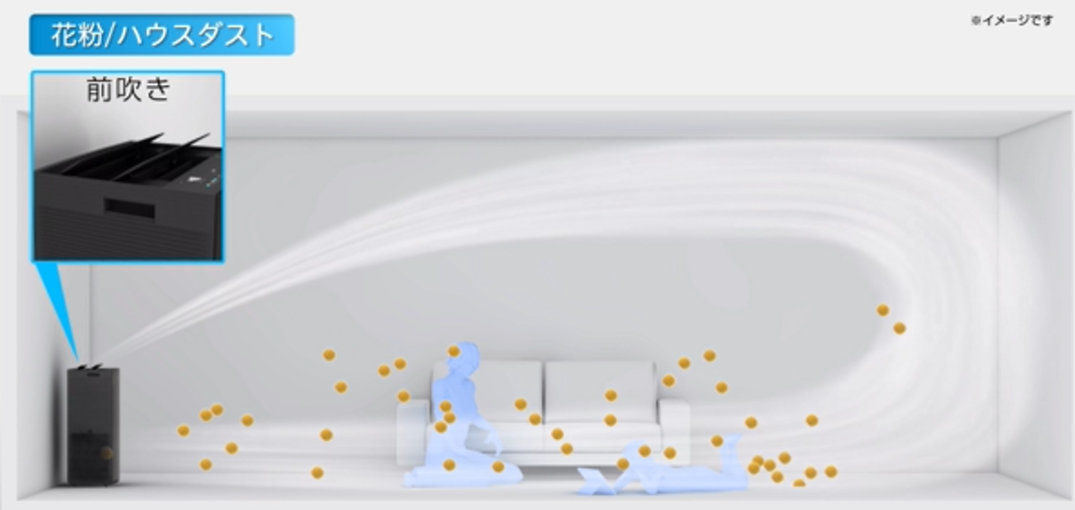 床上30㎝の花粉清浄スピードは、従来機比2倍になり、吹出速度を上げた前吹きの気流で花粉やホコリが床に落ちる前に効率よく捕集します。