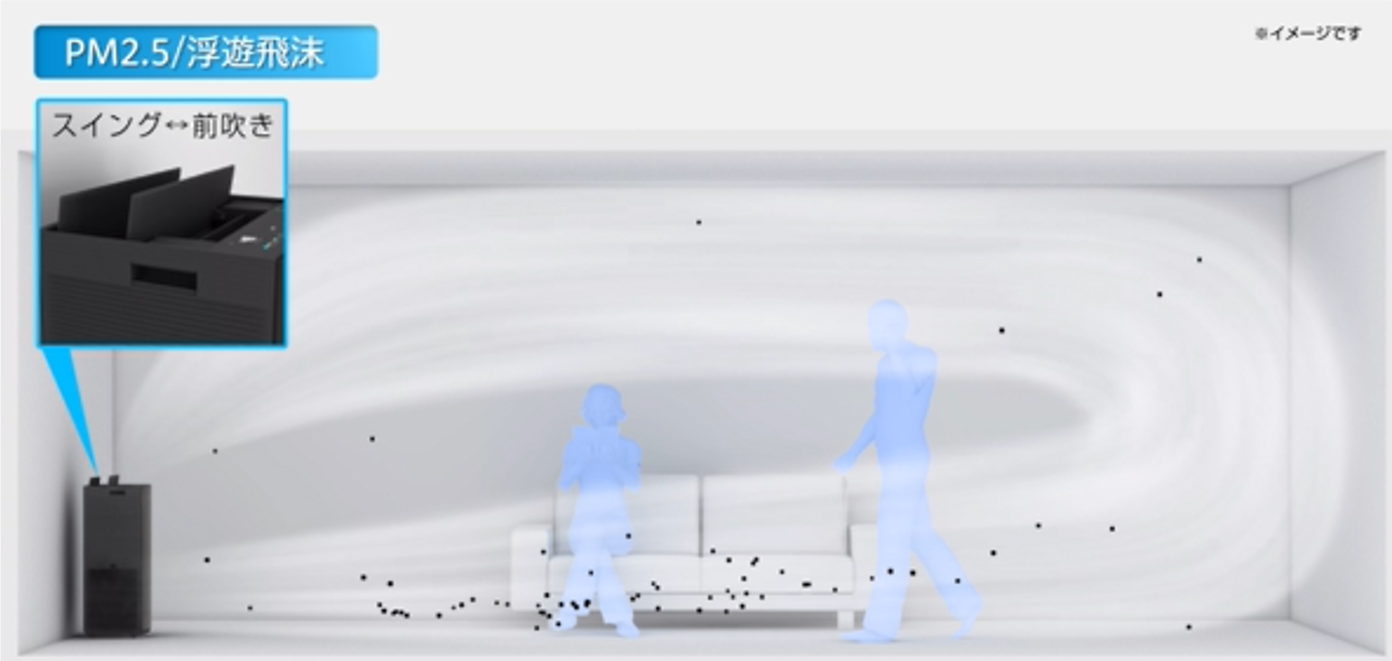 ツインフラップを上下に連続的に動かすスイングと前吹きを組み合わせることで、室内上部に滞留する微粒子を狙って循環気流で捕集します。