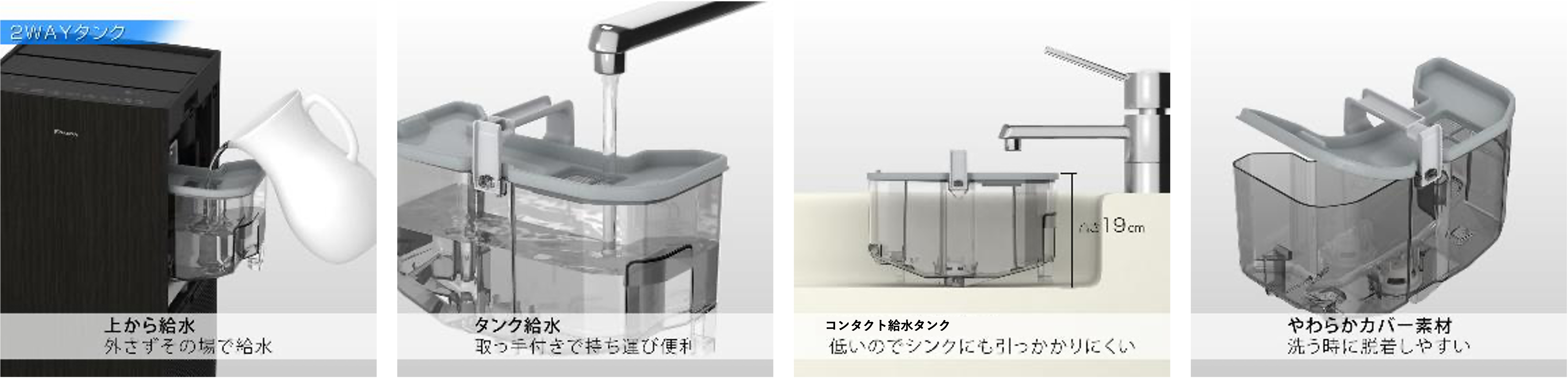 タンクを外して持ち運ぶことなくその場でも水を補給できる「上から給水」を採用し、給水タンクは高さ19㎝で、低いシンクにも引っかかりにくい設計にしています。また、脱着しやすいやわらかいカバー素材を採用し、使いやすさにも配慮しています。