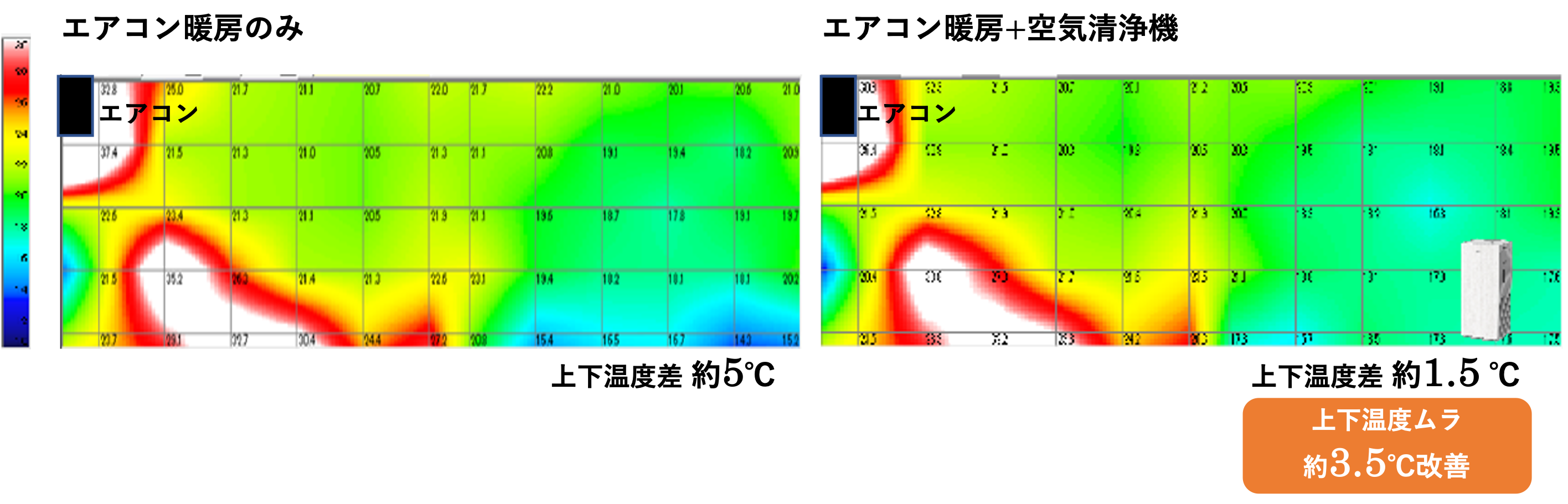アプリ内(Daikin Smart APP)でエアコンと空気清浄機の連動を設定した後、エアコン暖房を開始すると、空気清浄機が連動運転し、サーキュレーター効果で、足元付近の冷たい空気を撹拌するなど、ワイドリビングの暖房時の上下温度ムラを軽減します。設定温度到達時に室内の上下の温度ムラが、エアコン連動ありの場合は、約3.5℃改善※8します。