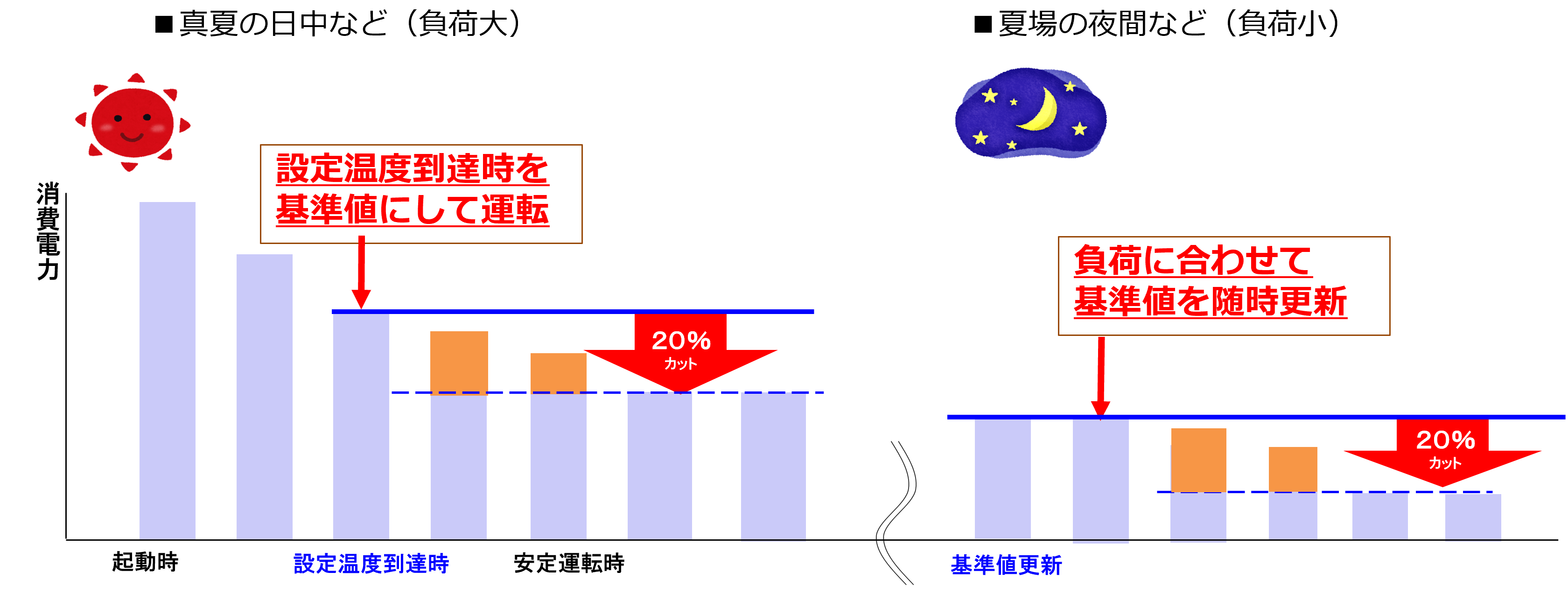 本商品に新しく搭載した「節電自動」の制御では、設定温度に到達した時点の消費電力量を基準値とし、20%削減※4しながら運転を継続することで安定運転時の節電を行います。基準値が負荷に合わせて随時更新されるため、さらに節電効果が高まります。日中よりも気温が低くなり、エアコンへの負荷が小さくなる夏場の夜間などは、基準値が自動で低く設定しなおされます。