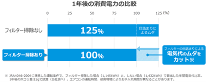 エアコンの室内機は部屋の冷たい空気を吸い込み、暖かい空気にして送り出すことで部屋を暖かくしています。エアコンのフィルターにホコリがたまっていると、熱交換器を通る空気の量が減り、熱を送り出す効率が下がります。その分、電気代がかかってしまいます。空気の通り道をふさがないよう、2週間に1回を目安に、フィルターの定期的な掃除を心がけましょう。エアコンのフィルターを1年間掃除しないと、消費電力が約25%も無駄になると言われています。フィルター掃除は節電に効果的です。