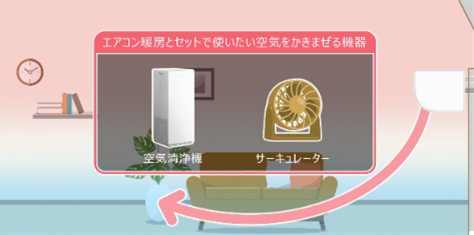 風向を下向きにしても、時間とともに温度ムラはできてしまいます。より温度ムラを抑えるには、空気清浄機やサーキュレーターなどの活用もおすすめです。エアコンと向かい合わせに置き、天井方向に風をおくります。室内の空気をかきまぜれば、さらに温度ムラがやわらぎます。気流をコントロールしながら、ムダな電力消費を抑えましょう。