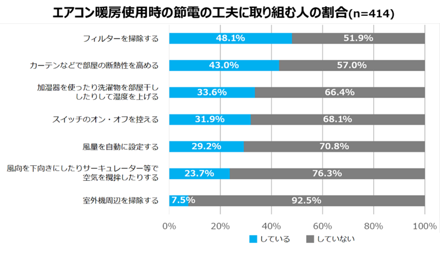 エアコン暖房使用時、節電への取り組みの実施率は半数以下