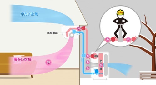冬、部屋が「寒い」と感じるのは空気中の「熱」が少ないからです。この熱を増やして部屋を暖かくするのがエアコンです。エアコンは、「室内機」と「室外機」がパイプ(配管)でつながっていて、暖房時には屋外の「熱」を室内に移動させて部屋を暖かくしています。