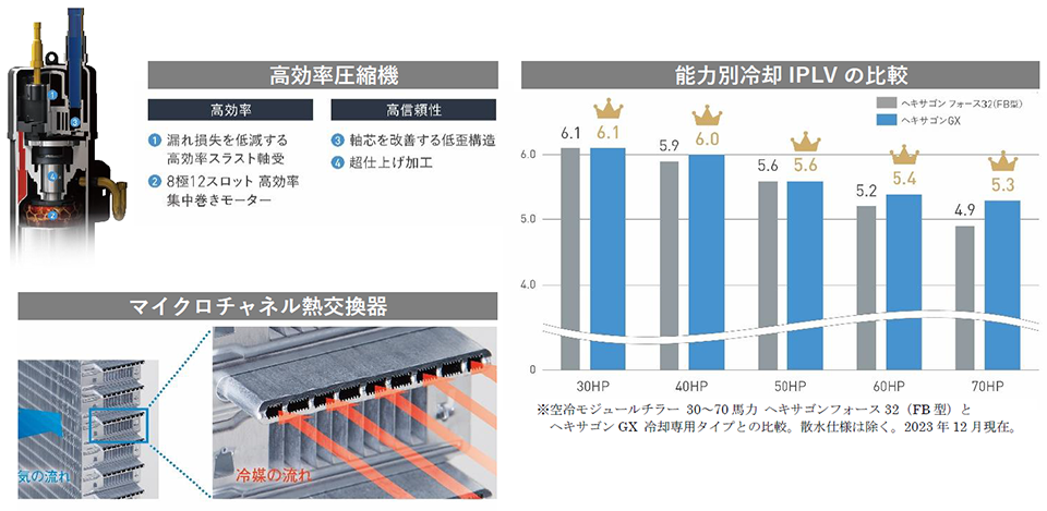 本商品は、エネルギー効率に優れた低温暖化冷媒HFC-32(以下「R32」)に適した高効率圧縮機とマイクロチャネル熱交換器を搭載し、低負荷時の運転効率を従来機と比べて最大8%向上※2させ、業界トップクラスの冷却IPLV※3を実現しました。また、冷媒充填量を従来機と比べて約57%削減※4し、環境負荷も大幅に低減します。