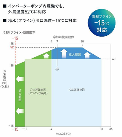 また、ブライン改装機においては従来機の-10℃よりも低い-15℃のブライン出口温度にまで対応し、より幅広いプロセス用途での冷却を実現します。