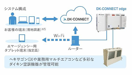 本商品は、建物全体の空調機器を集中管理できるクラウド型空調コントロールサービス『DK-CONNECT』への接続に対応しています。『HEXAGON GX』および『モジュールコントローラー』※13を『DK-CONNECT』に接続することで、チラーやチラー内蔵ポンプをPCやスマートフォンで遠隔から簡単に操作できます。また、『DK-CONNECT』にはダイキン製のファンコイルユニットやコンパクトエアハンドリングユニットも接続できるため、熱源から2次側までのアプライド空調システム全体のトータルな管理と操作が可能になります。