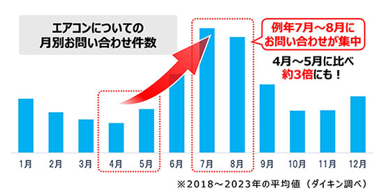 例年、エアコンのお問い合わせや点検のご依頼は、エアコンを使い始める6月頃から増え始め、7月、8月に集中します。混雑により暑い時期に修理対応をお待ちいただく場合があるため、本格的に暑くなる前の4月~6月前半に試運転を行い、早めに準備を済ませていただくことをご提案しています。