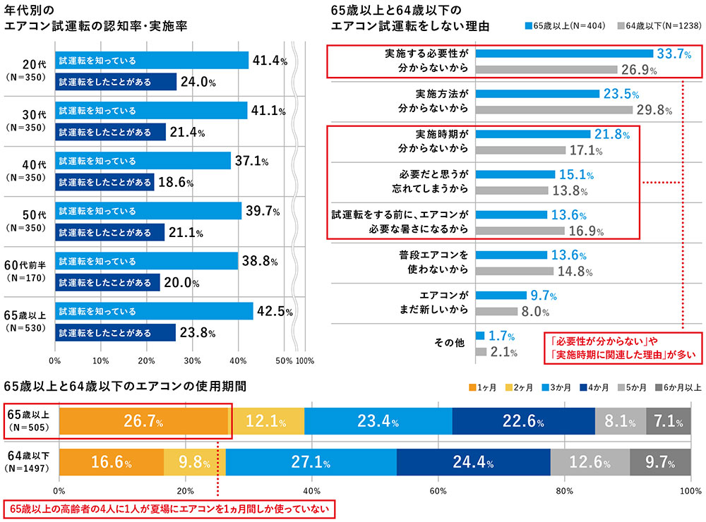 一方で、エアコンの試運転をしない高齢者にその理由を確認したところ、「必要性が分からないから」と回答した割合が33.7%で、64歳以下の人と比べてエアコンの試運転に必要性を感じていない人が多いことも分かりました。さらに、65歳以上の高齢者にはエアコン使用期間が短い特徴もあり、約4分の1は夏場にエアコンを1ヵ月間しか使っていないことも明らかとなりました。高齢者は加齢により暑さを感じにくくなると言われており、気付かないうちに重篤な熱中症になってしまう可能性もあります。エアコンを適切に使うことを高齢者に呼び掛けることの重要性も浮き彫りとなる結果となりました。